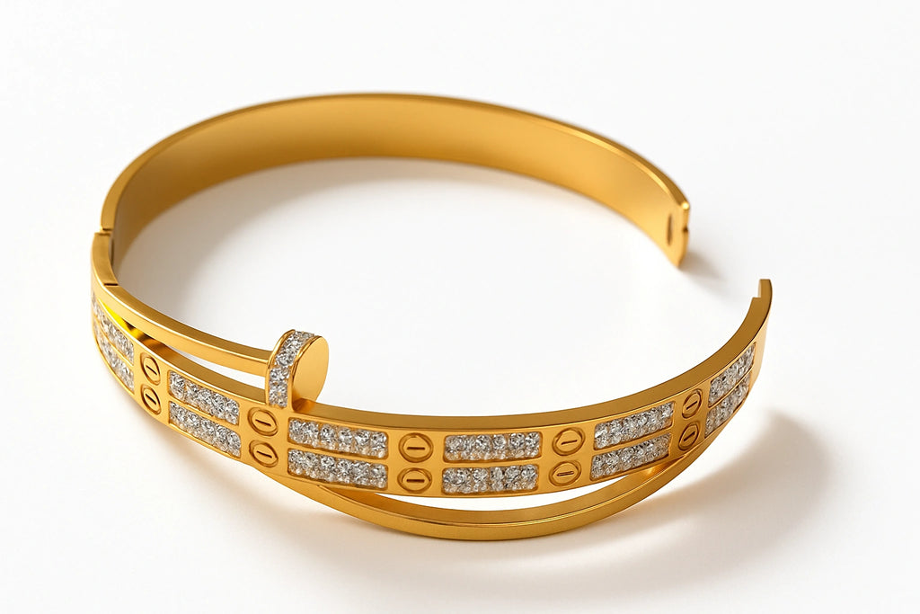 A bold fusion of contemporary design and timeless luxury, this gold bangle showcases a unique screw motif accented with brilliant pavé-set diamonds. The sleek structure is enhanced with rows of sparkling stones, exuding elegance and sophistication. Its open-ended design ensures a modern edge, making it a perfect statement accessory for fashion-forward individuals who appreciate both refinements. Ideal for special occasions or daily luxury wear.