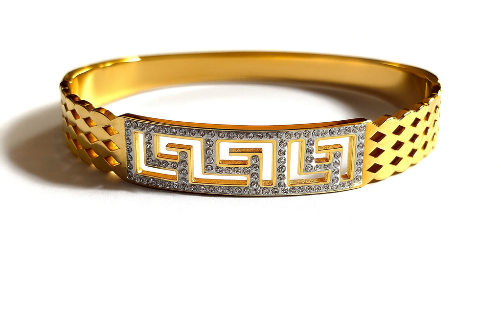 This striking gold bangle showcases a bold Greek key motif, framed with a border of shimmering pavé-set diamonds for added brilliance. The sides feature a textured lattice pattern, enhancing its luxurious appeal. Perfect for special occasions or elegant everyday wear, this bangle is a timeless statement piece that combines tradition with modern sophistication.
