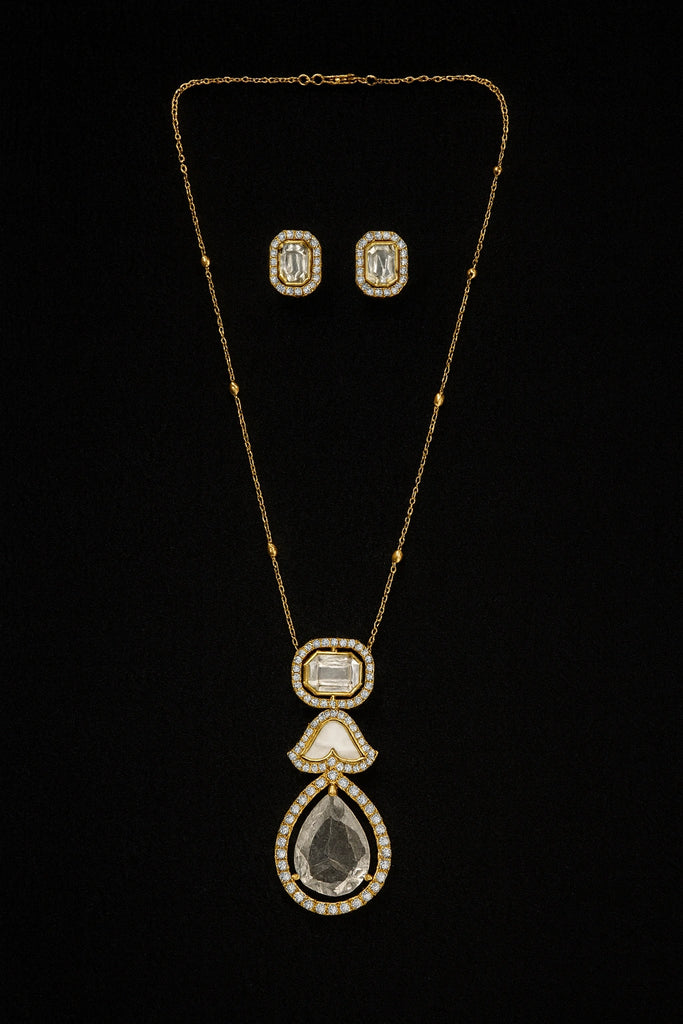 A statement jewelry set featuring a dazzling layered pendant with cushion-cut, chevron, and teardrop Kundan stones, bordered with sparkling crystals. Paired with matching stud earrings, this set is perfect for weddings, festive occasions, and evening celebrations.