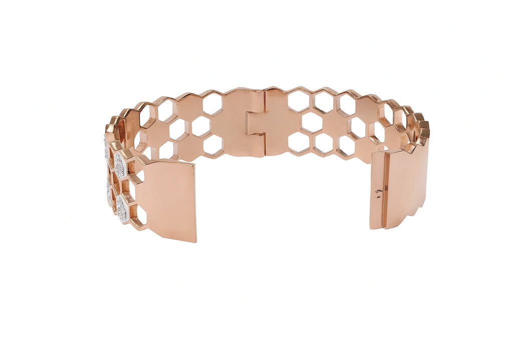 Crafted with precision, this rose gold honeycomb bangle blends modern artistry with timeless elegance. The open hexagon pattern is accented by diamond-encrusted clusters and a bold rectangular enamel centerpiece framed with sparkling diamonds. Lightweight yet luxurious, this statement bangle is perfect for elevating evening wear or adding a refined edge to everyday style.