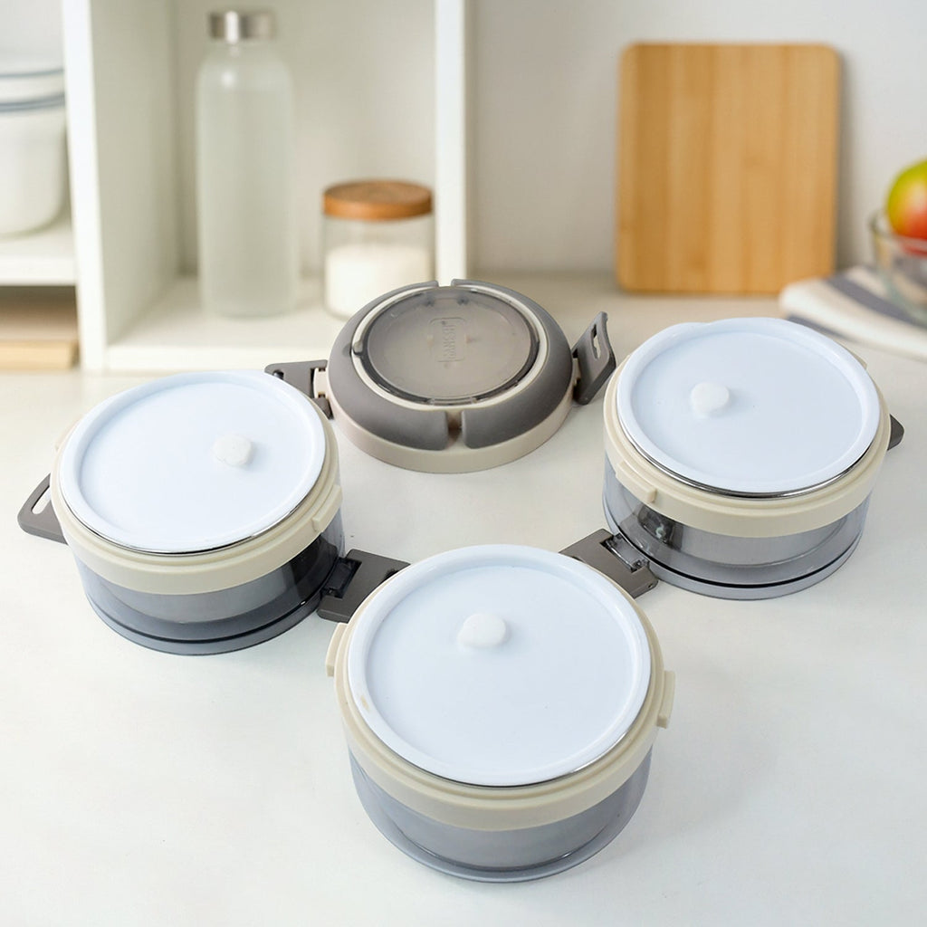 The set includes three individual stainless steel inner containers, ideal for separating your lunch into mains, sides, and snacks. The containers are housed in a sturdy BPA-free outer shell that insulates and protects your food, ensuring it stays warm and fresh for hours.