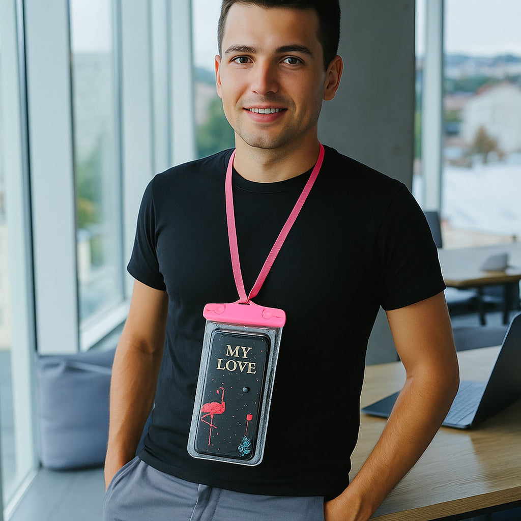 It comes with a neck strap to securely hold the pouch to your body and crystal clear windows on both front and back side makes it perfect for taking pictures, videos and surfing. Back side is fully transparent, so no issues with camera for bigger phones.